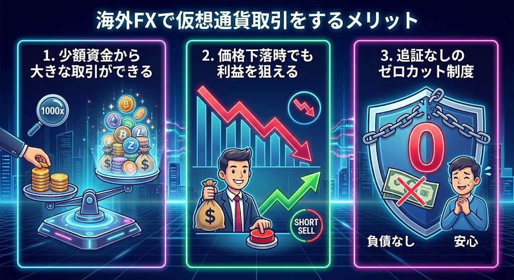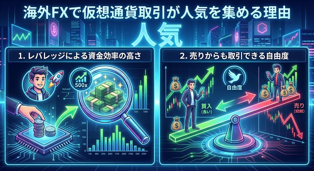 海外FX業者では、ビットコインやイーサリアムなどの仮想通貨をレバレッジ取引できる環境が整っており、高い収益機会が期待できます。